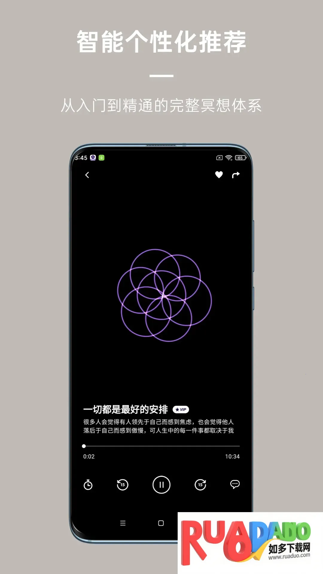 2、它使用方便,每天花几分钟跟着音频静下心,就能赶走烦躁和疲惫;情绪焦躁时听舒缓声音引导,可找回内心的安定和平静;专为睡眠设计的音频能助眠。