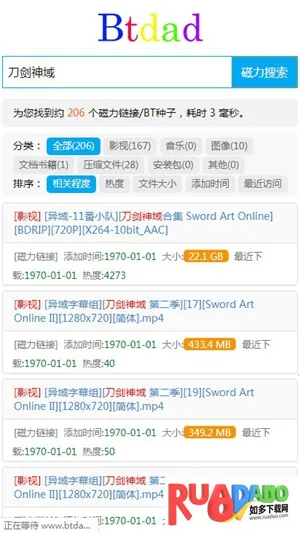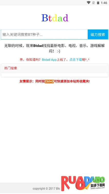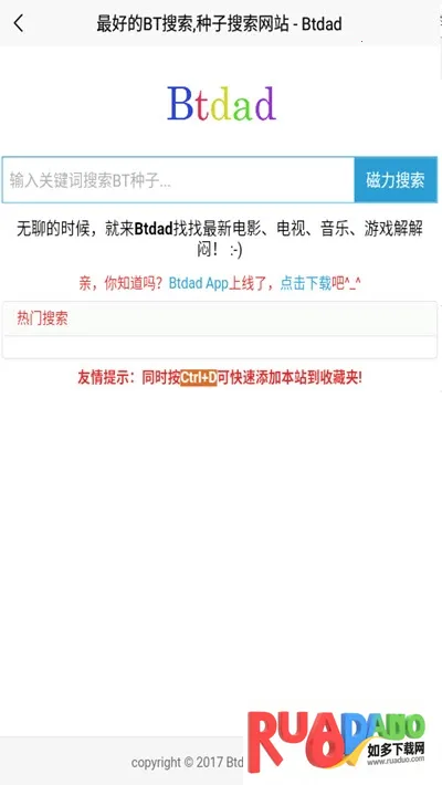 而且操作简单便捷,界面简洁,搜索方便又快速。找到的磁力链接能通过其他解析软件解析后下载,资源质量也有保障。另外,它还能保存收藏感兴趣的网址,开启无痕浏览模式保护隐私。如果你有资源搜索下载的需求,btdad绝对是个实用的利器,赶紧下载试试吧。