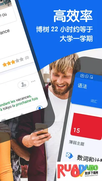1、博树是专为学习外语用户打造的软件。它包含多种语种,学习各地区语言更便利,每天花10分钟就能完成学习目标,累积外语知识。