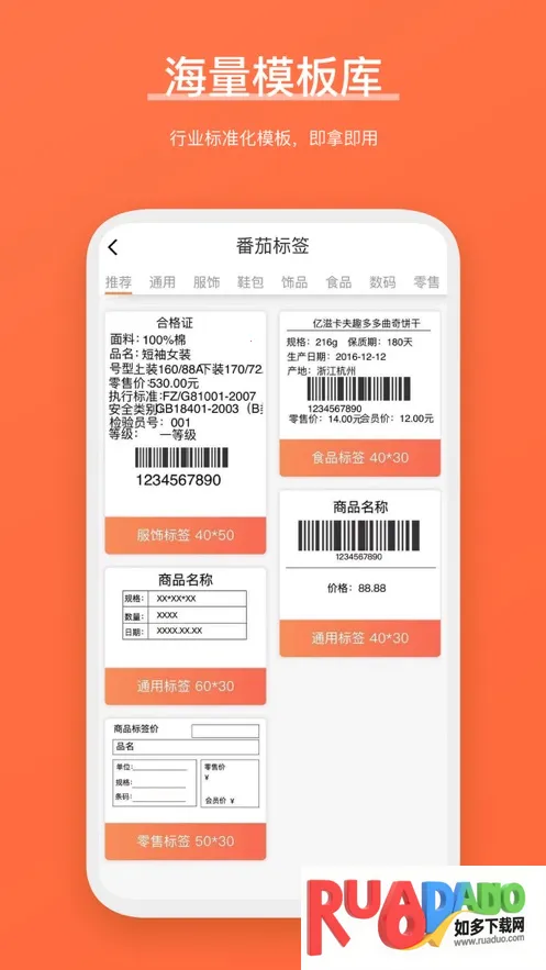 2. 拥有丰富的标签模版库,涵盖鞋包、服饰、食品、珠宝、数码等常见领域,即拿即用,支持在标准模版上插入任何形式的图标等。