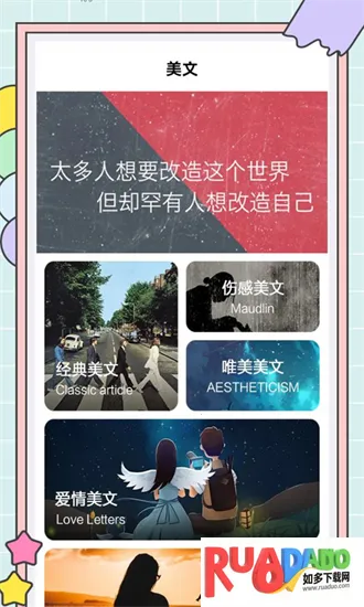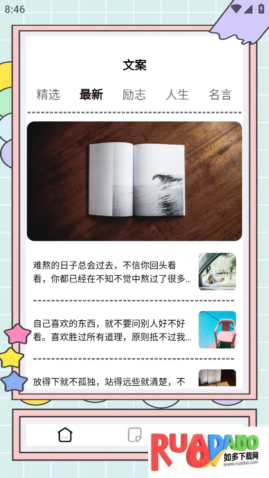 2. 提供多种精选资源,包括早安晚安问候、个性签名、鸡汤毒汤等,轻松应对各种写作需求。