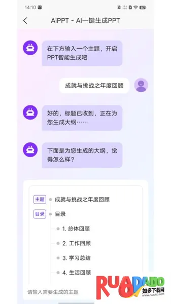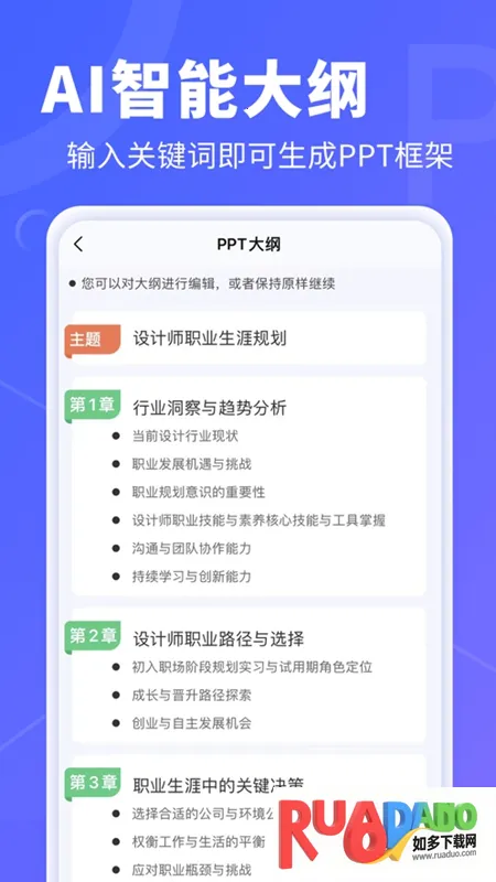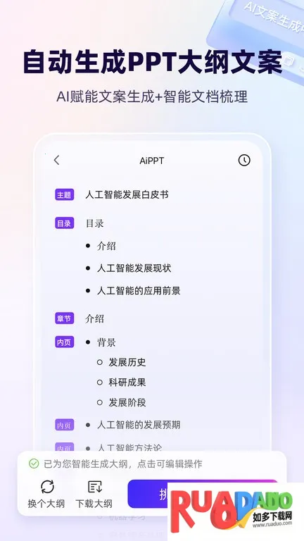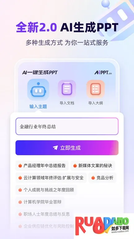 AiPPT2025官方正版是一款基于AI的PPT在线生成工具,结合先进技术与专业团队智慧。输入主题或关键词,能一键生成含文字图表图像的PPT,有海量模板,支持在线编辑协作,全端口跨设备同步。