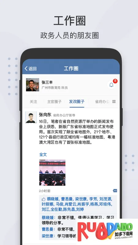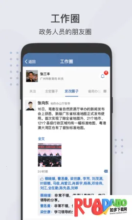 2. 开放平台支持自建应用,各地各部门可以根据省内统一的规范,将自身的非涉密公文系统和成熟业务应用接入粤政易,实现在移动办公平台上对公文和审批的一站式办理。