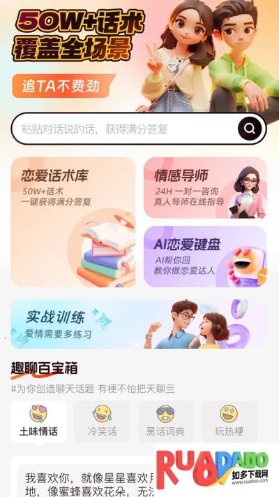 恋聊高手是单身人士的恋爱话术软件库,涵盖各类优质话术。有土味情话等多种类型,能避免尬聊。还具备丰富亮点、特色与优势,如持续更新话术、真人导师答疑,助你成为恋爱达人追到心仪对象。