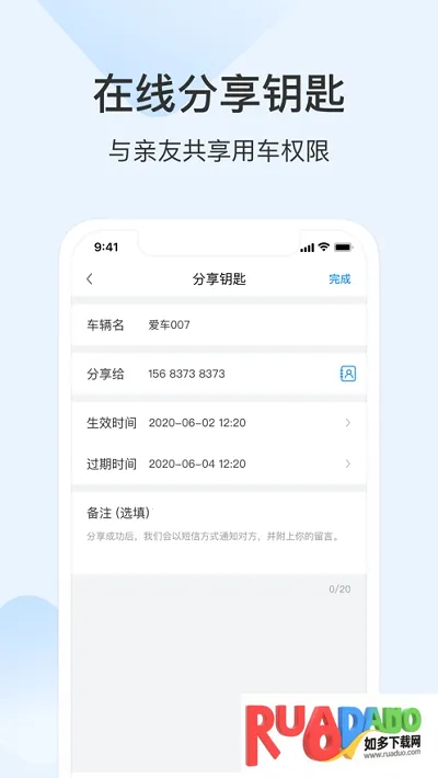 3. 钥匙共享轻松实现,可在线分享并设置有效期,权限分级灵活管理用车。