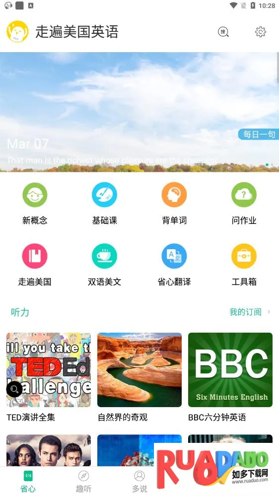 走遍美国英语安卓版是一款免费英语学习软件,由武汉省心天下科技有限公司开发。它功能丰富,涵盖多模式播放、字幕跟读、生词管理等,内容全面,适合各阶段学习者,能助您提升英语综合能力。