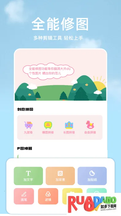 手机P图宝是一款图片编辑软件,有各种优质编辑功能,免费滤镜和模板随时用。能分享编辑技巧,提供多种拍摄模式,一键美化照片,热门材料实时更新,简单有趣易上手,可满足多样编辑需求。