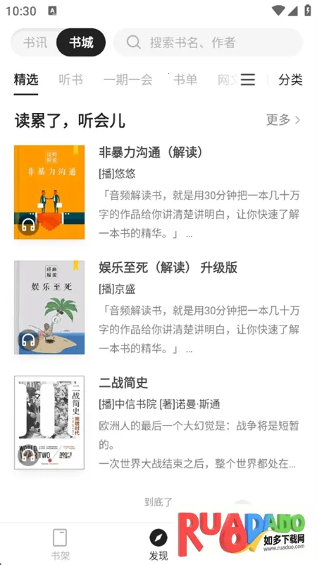 2. 发现页面能按分类快速找书,收藏书籍自动加入书架。