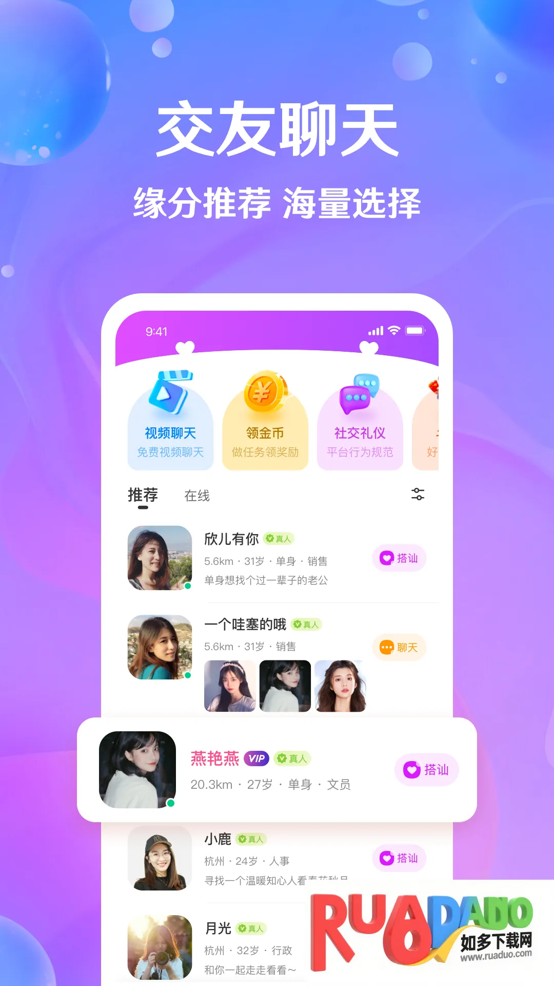4. 有双重认证实名,动态社区可分享生活,同城聊天快速交友,视频速配更真实直接,能带来贴心的聊天交友体验。