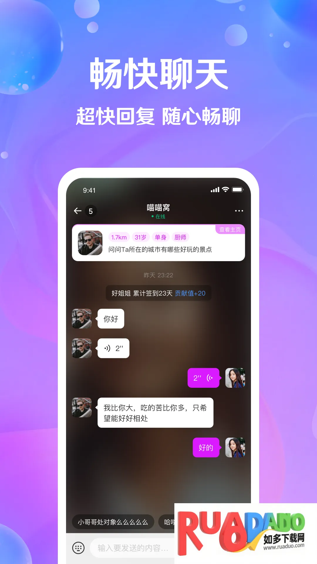 3. 支持多种聊天方式,如文字、语音、视频通话等,还能与同城附近异性聊天互动,找到心仪对象。
