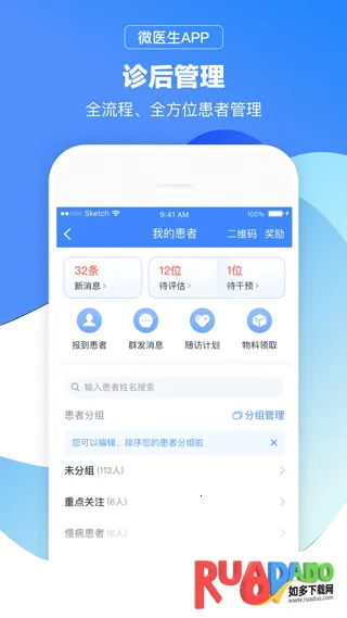 2. 患者报到:通过微医,患者可与医生建立联系,便于长期咨询诊后随访诊中关怀用药调整等。