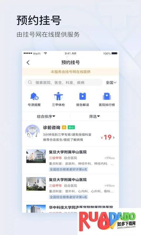1. 专家问诊:图文电话视频三剑合璧,实现患者与名医的远程沟通在线诊疗,极大提高就医效率,足不出户看名医。