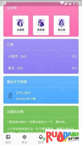 出国全能王-翻译官是一款专业翻译软件,模式齐全,有万能英语翻译、多语种实时翻译等。具备文本图像识别等功能,支持脱机翻译,能满足各种翻译需求,如行程翻译、情景语言翻译等,简单易用。