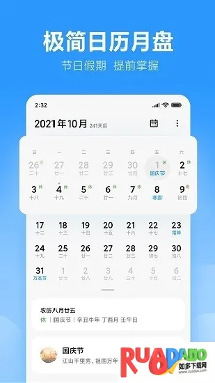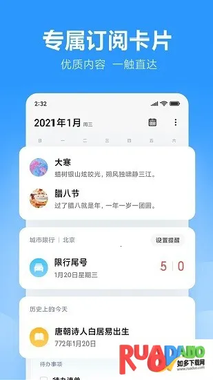 小米日历2025最新版本是小米科技为Android平台开发的实用日历应用。功能强大,能查看时间日期、定制行程、查运势天气等。支持多种视图,可语音输入、导入日程,还有课程表等订阅服务,方便管理时间与任务。