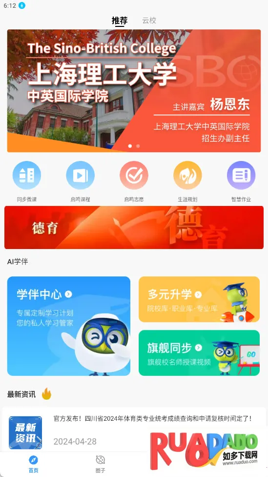 启鸣云校是启鸣达人珠海横琴教育科技有限责任公司打造的家教共育教学平台。通过大数据为学生定制专属计划,补强薄弱环节。有成绩查询、学习记录追踪等功能,分首页、圈子、云校、我的四大板块,助力家校共育与学生成长。