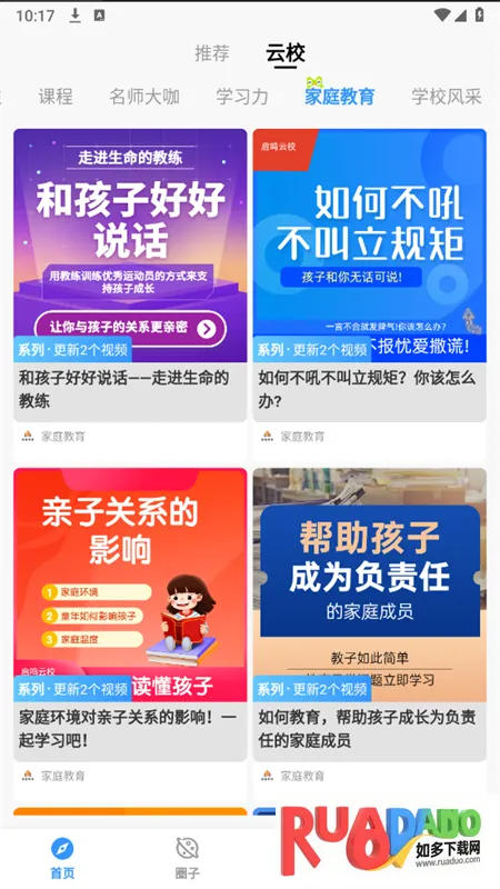 2. 是家校沟通的工具,分为首页、圈子、云校及我的板块,加强多方沟通,全方位提升学生成绩。