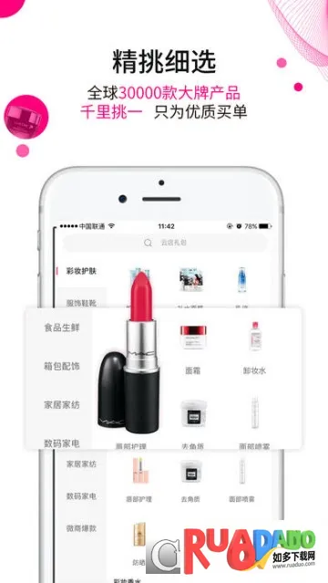 2. 平台产品编辑精选,涵盖美妆护肤、精品家具、流行服饰等七大种类。