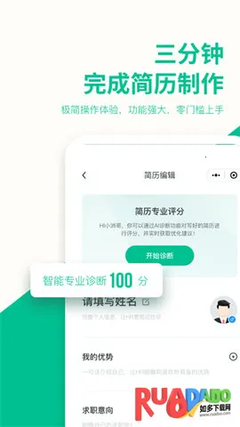 3. 提供智能专业诊断功能,制作完简历后可进行专业评分并给出优化建议,提升简历竞争力。