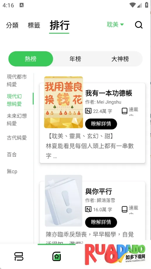 1. 这里小说类型齐全,涵盖言情、都市、耽美等,能满足不同用户追书需求。