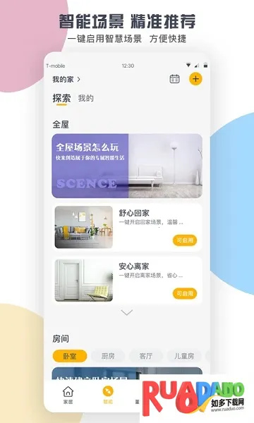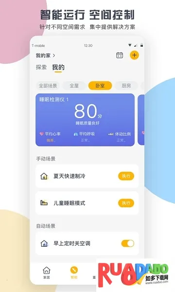2、多场景联动与个性化定制,有回家、睡眠等预设场景,可自由组合家电状态一键启动。
