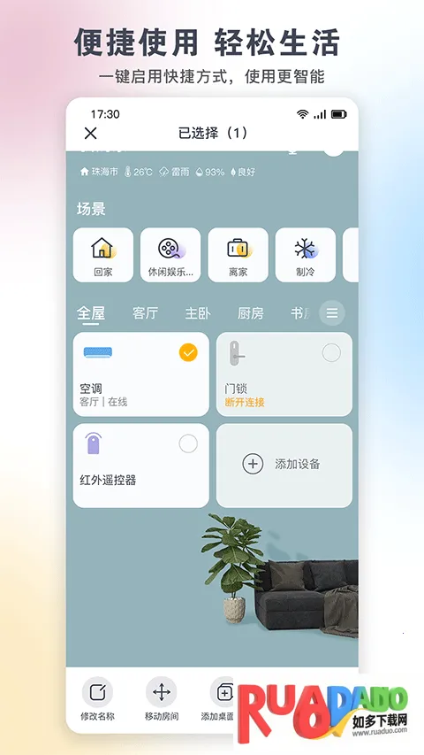 1、格力智能家居安卓版手机版支持扫描设备二维码或自动搜索附近设备,能快速完成配网,实现远程控制。