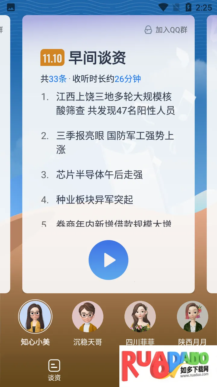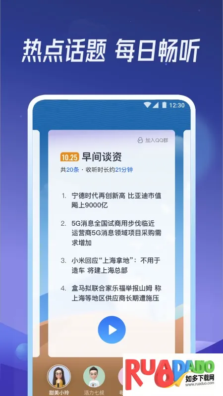 出门听听2025官方最新版本是一款有声新闻软件,提供免费数字收听服务。采用AI语音合成技术,有4种AI声音可选。资讯分类多,涵盖社会热点、国家政策等,每次播报超25分钟,能让用户随时掌握各类信息。