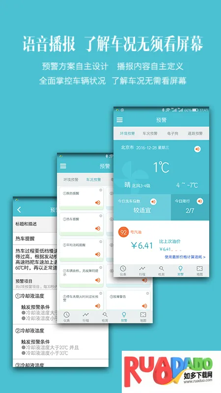 2. 支持蓝牙连接MOBD车况检测适配器,查看车辆运行、油耗、体检、行程信息,实时语音提醒。