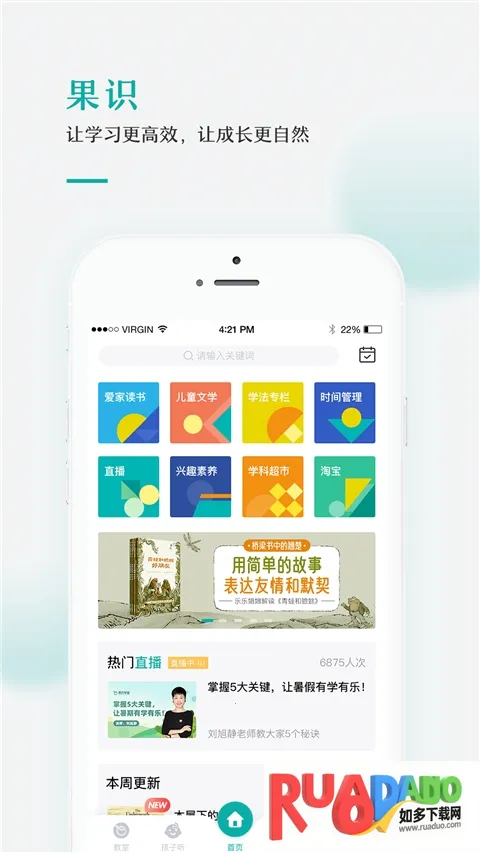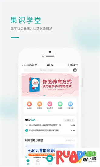 果识学堂是一款家庭教育平台,以让学习更高效、成长更自然为使命。提供精选书籍解读、音视频课程等资源,涵盖多学科知识,还有时间管理等功能,助力打造学习型家庭,为中国家庭幸福提供方案 。