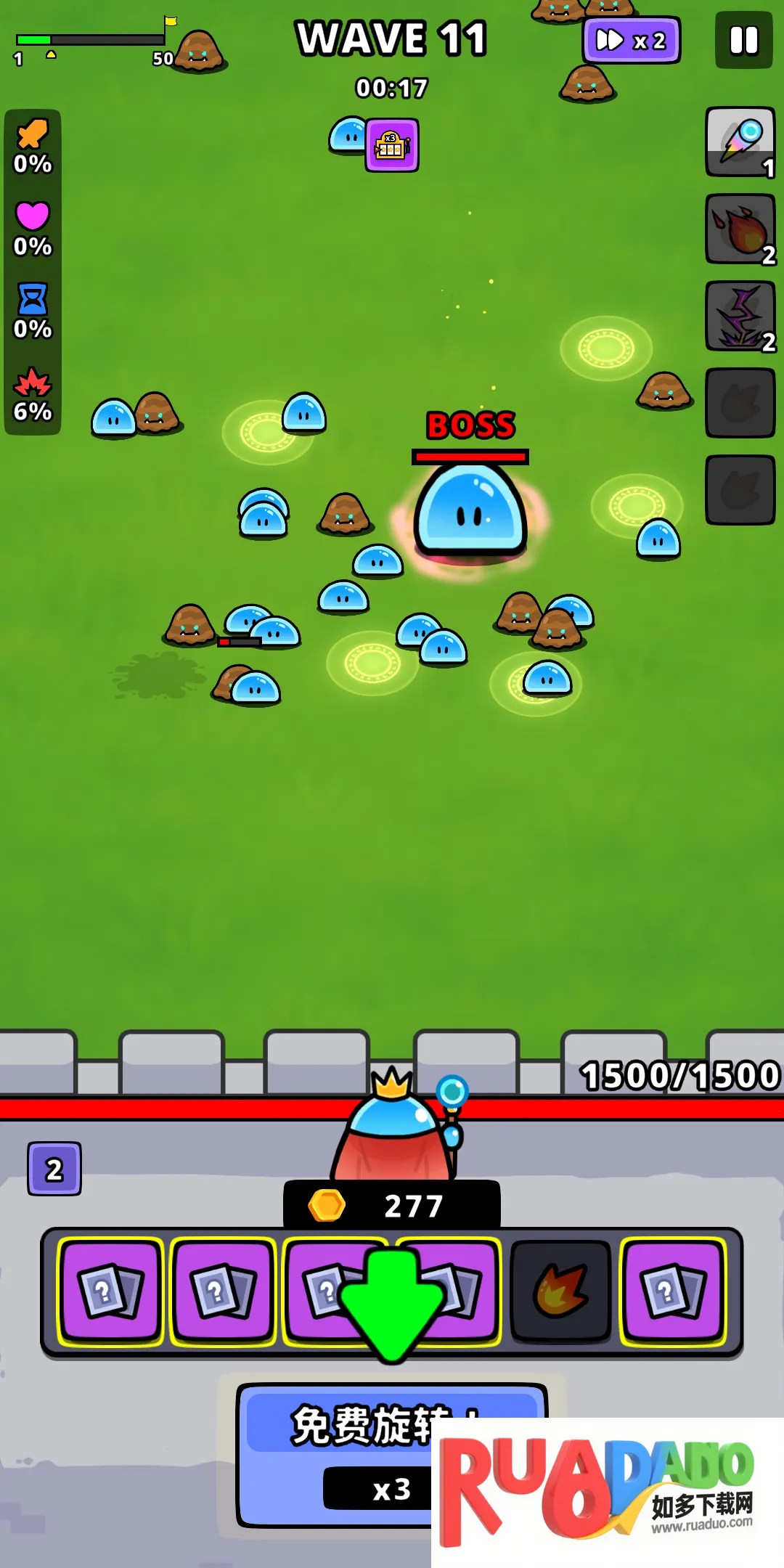 2. 城堡初始血量 500 点,每关 15 波常规魔物,第 15 波后有概率触发隐藏 BOSS 战。