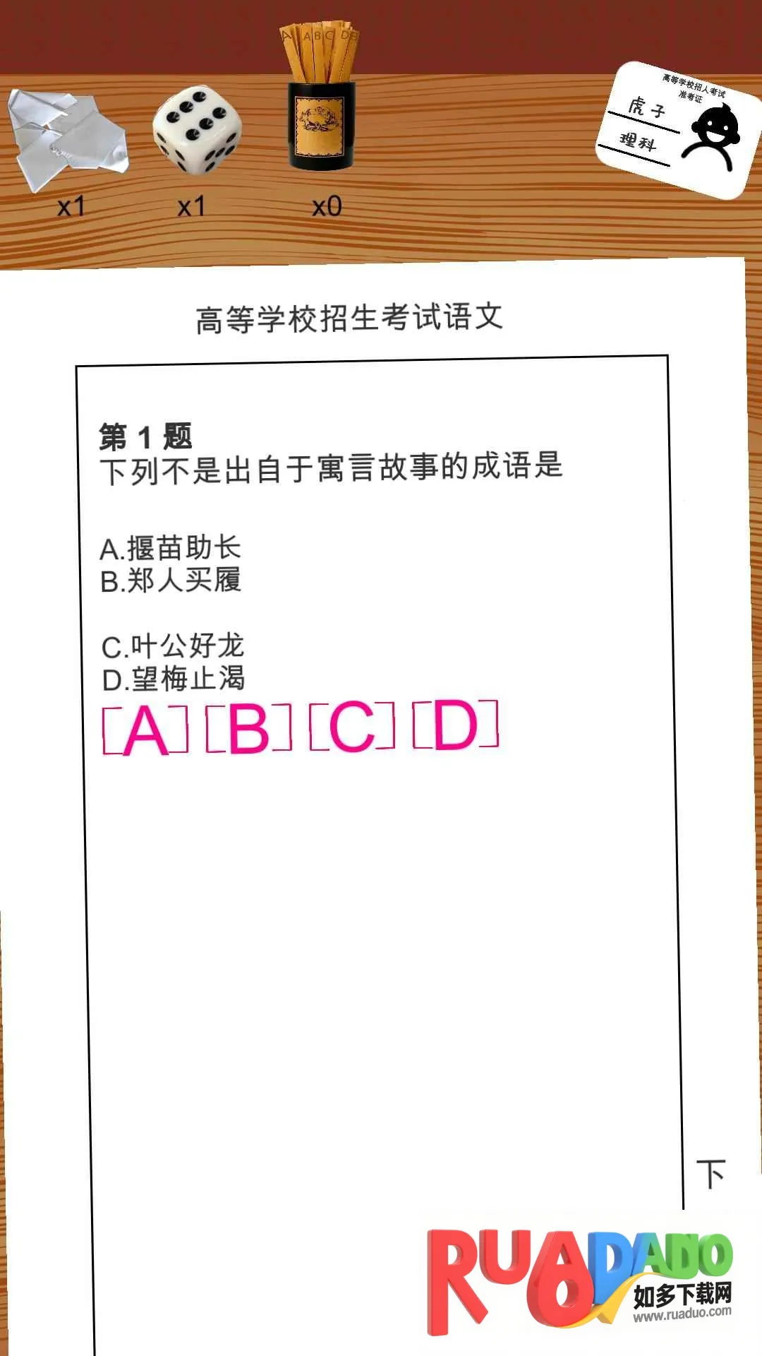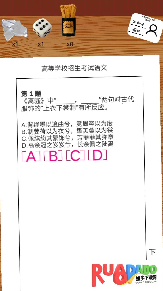 嘿,同学们!要是你想提升高考作文水平,那这款游戏能帮大忙啦!它模拟高考场景,有各种科目题目,涵盖语文作文相关内容。在游戏里,你能重新回到高考年代,不断努力提升知识储备。通过一次次考试发挥,拿到好分数,还能解锁全新挑战。这里面有真实模拟紧张高中生活的体验,让你认真对待每一次考试,就像重回真实课堂。你可以选择不同状态参加高考,选好喜欢的学科和难度,带着准考证进入考试。每科随机抽取五道题,完成六科考试后就能查看成绩啦。而且还有各种特色设定,比如能去孔庙获取祝福得答题 buff,还有道具帮助做题。通过考试不仅能知道自己能上哪所大学,答对题目还有丰富奖励。快来试试,看看自己高考作文水平咋样,能不能在游戏里取得好成绩,考上理想大学呀!