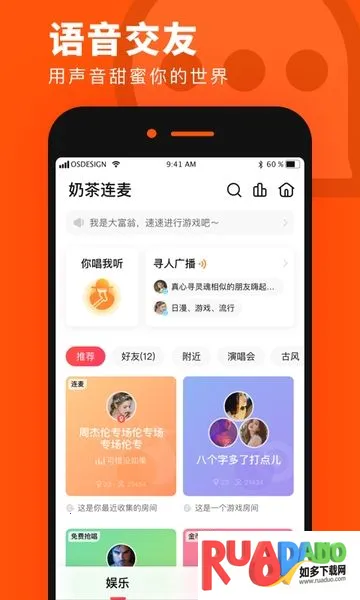 奶茶连麦2025官方正版是免费在线语音社区,能创建虚拟房间点歌演唱,有实时歌词与打分,支持微信和唱吧登录。可连麦各地同好聊天互动做游戏,还有恋恋广播等特色功能,交友方便趣味多。