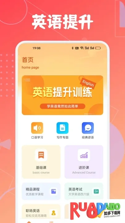 1、在首页中提供了口语学习、写作专题、经典谚语、基础课、进阶课、精品课程、英语考试、职场英语和口语天天练等模块;