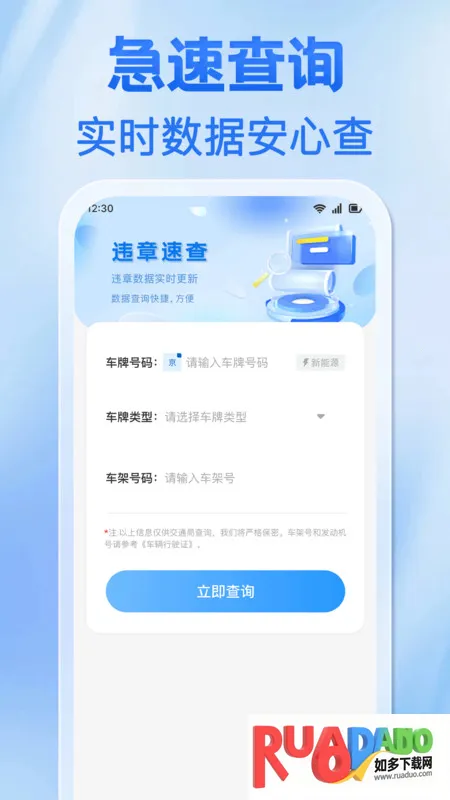 1. 提供多个查询功能,可进行违章码查询与限行查询。