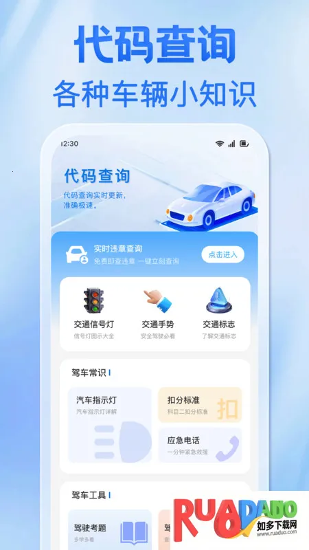 1. 能了解各种违章代码,输入后可展示扣分行为分数与罚款等各类信息。