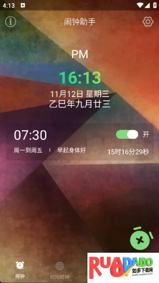 闹钟助手2025官方正版是一款多功能智能闹钟应用,提供起床闹钟、秒表计时、世界时钟等,可重复提醒,还有日历天气、精美壁纸。能简单实用设置闹钟,自动记录时间,清晰标注日历,满足多样需求。