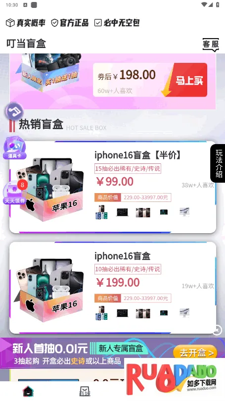 叮当盲盒是一款盲盒购物软件,新人首抽0.01元。商品涵盖家电、手办等多样品类,均为正品。有保底开盒机制,不喜欢可兑换。每日签到领豪礼,还能交流盲盒知识、欣赏作品,玩法丰富,物流追踪便捷。