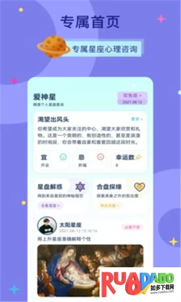 爱神星最新手机版是星座科普平台,提供不同星座详细科普、运势,可进行星座匹配、本命盘解读。还有在线咨询,有精准查询、专业资讯等特色,能满足星座爱好者对星座知识及星盘解读等需求。