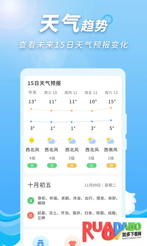 极速天气预报通 2025 官方正版是强大生活服务软件,能提供多样天气预报功能,如查不同地区天气、穿衣建议等。操作简单,天气数据详细准确,含温度、空气质量等,还有背景可自由调整,消息提醒恶劣天气。