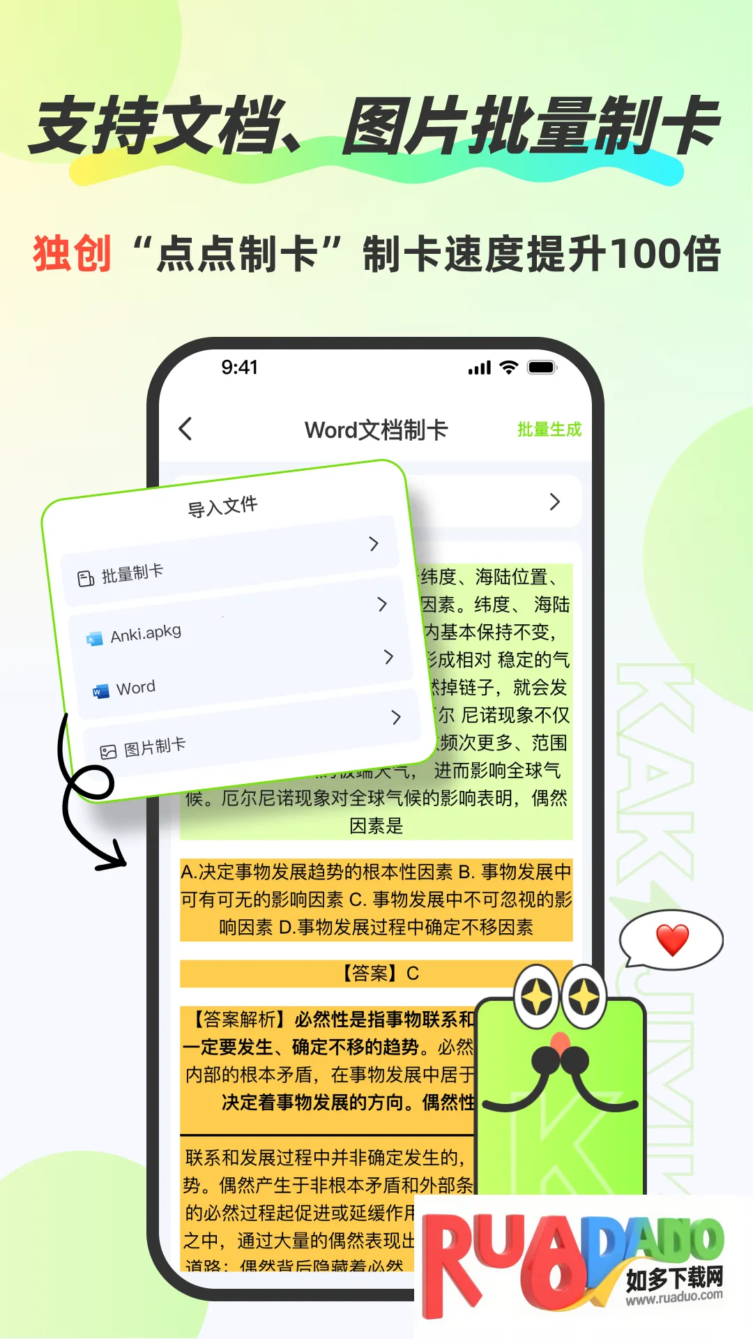 速记卡App是一款超棒的知识记忆工具,适合全年龄段学习者。它能解决大家在学习中高效记忆知识点的难题。其功能超丰富,有卡片记忆系统,可创建含文字、图片、音频的多媒体卡片;知识树管理能帮你整合知识点形成框架;双链记忆法让知识点相互关联成网络。多语种TTS朗读覆盖十余种语言,满足听说训练。还有文字与图片挖空、分屏画板、学习热力图等辅助工具。导入与共享功能也很实用,支持多种文件一键导入,还能社区共享资源。它的优势明显,有科学记忆算法,跨平台同步,高度个性化定制。能轻量化学习提醒,生成AI助记口诀,自动聚焦薄弱环节。利用碎片时间就能学习,降低学习门槛,通过数据驱动优化学习效果。操作也不难,新建、编辑卡组属性、导入外部卡组都有清晰步骤。有了它,学习更高效,快来试试吧!