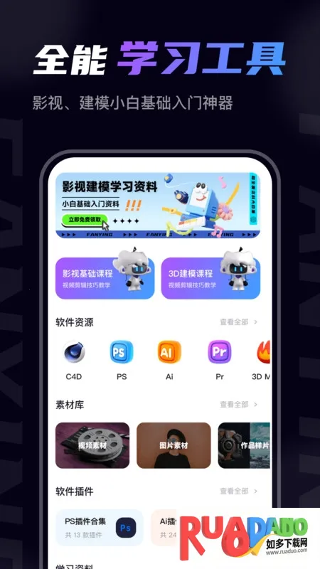 梵映影视建模是一款超棒的影视后期三维建模学习平台。它能解决影视后期三维建模爱好者的学习难题。功能超丰富,有从零开始的系统教程,围绕主流软件提供从入门到进阶的视频课程,避免碎片化学习。海量高质量素材库,多种资源按场景与风格分类,方便检索收藏,做练习或接单不愁素材。还有项目化实战思维课程,带你完整走一遍影视建模流程,形成完整思维链路。移动端轻松学习,界面清晰,支持倍速播放与离线缓存,碎片时间也能提升技能。软件亮点多,对小白有友好引导,一站式资源整合,有创作灵感专区,内容持续更新。按影视后期课程、3D建模、手绘基础等模块分类,还有素材集市、软件资源与插件、作品与案例参考等功能。总之,用它能高效学习影视建模,把兴趣变成专业技能与作品。