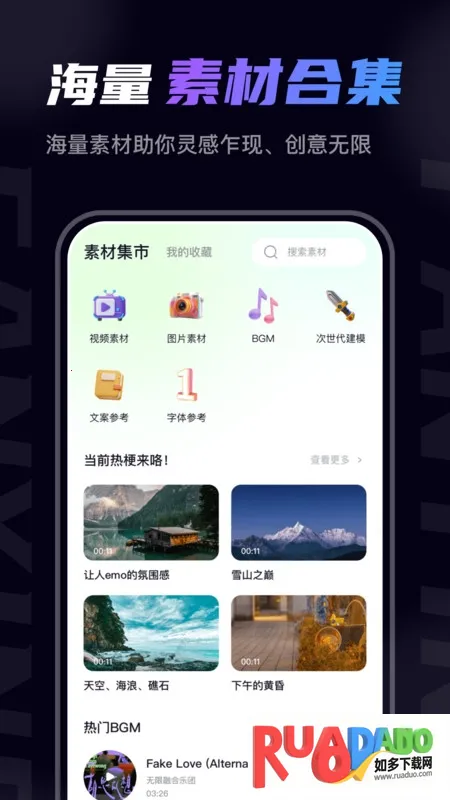 1. 海量高质量素材库,视频、图片、BGM 等多种资源按场景与风格分类,方便检索收藏,做练习或接单不愁素材。