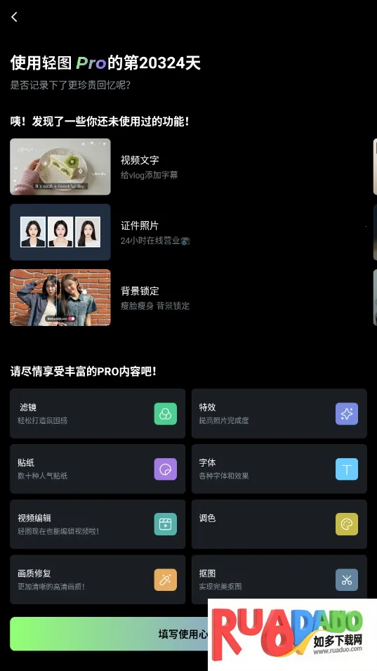 2. 滤镜贴纸字体素材丰富,满足多样修图风格尝试。