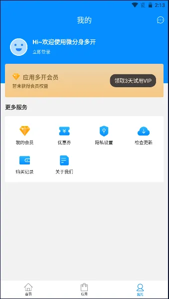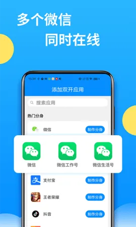 微分身多开2025官方最新版由上海鑫义信息技术有限公司推出,兼容安卓13系统。支持64位应用多开,能实现社交、游戏等多类应用多开,账号独立运行,操作简单,安全稳定,还内置部分游戏辅助功能 。