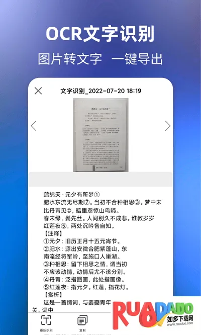 1. 操作简便,对准文字拍照即可识别,支持自定义区域,还能自动扫描,双手无需操作。