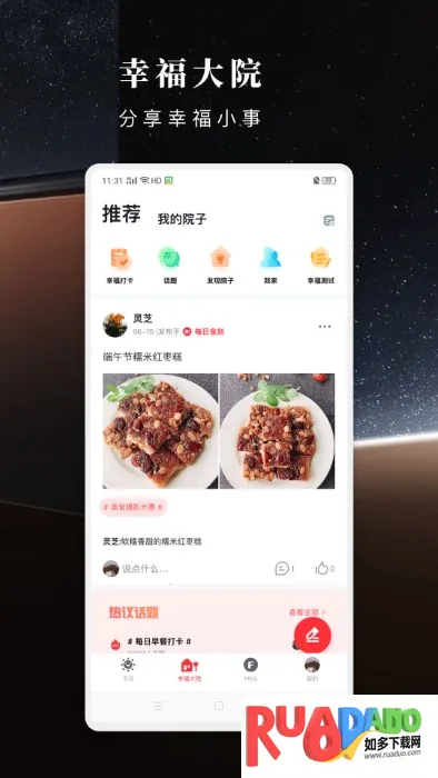 3. 幸福大院是用户分享生活的社群,加入感兴趣的院子,分享心得、参与话题,还有话题礼物和每日打卡体系,能与伙伴共同提升幸福感,养成好习惯。