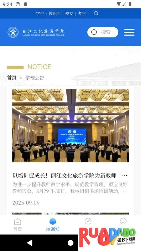 丽江旅院是丽江文化旅游学院官方移动应用,整合校园全场景服务与资讯资源。为师生提供教学、生活、就业等服务,有通知、搜索、办事大厅等功能,保障安全,满足不同角色需求,提升校园生活效率。
