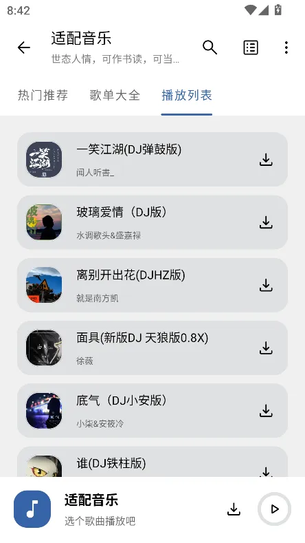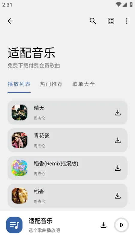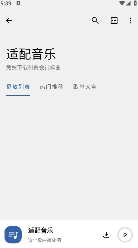 适配音乐安卓版是免费无广告的音乐播放器。整合多平台榜单资源,支持多种搜索方式。具备音乐播放、下载、管理等功能,有个性化推荐。界面简洁,音质优,资源全,能适配歌词,带来纯粹音乐体验 。