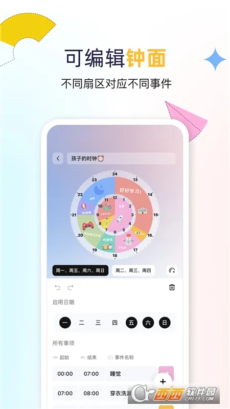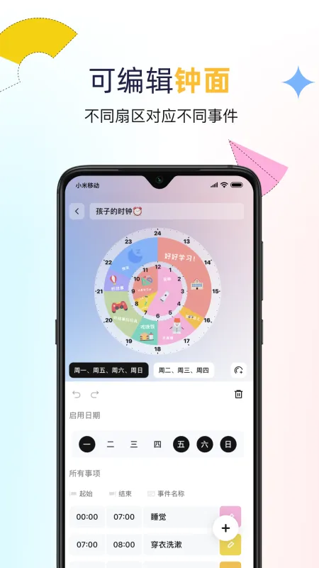 2. 助力时间管理:将孩子一天 24 小时事件以贴纸文字呈现于钟面,指针指向处即显示该做的事项,帮助孩子建立时间与事件的联系。