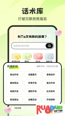 恋爱技巧高情商聊天话术类工具超实用!它能帮咱解决聊天难题,提升社交能力。这里面有各种精选的高效聊天技巧,像开场白、礼貌问候、回答问题等都有详细分类和使用指南。不管是内向还是外向的人,在工作、约会等不同社交场合,它都能根据你的类型和所处场景,给出专属定制化建议。而且还有实战练习模式,能在虚拟场景下模拟社交聊天,系统实时分析并反馈,让你清楚自己的优缺点,针对性改进。基于科学研究成果,内容持续更新迭代。操作简单易上手,哪怕没聊天经验也能快速学会。有了它,就能更自信地与人交流,轻松建立更好的人际关系,想提升社交能力或者改善关系的,用它准没错!