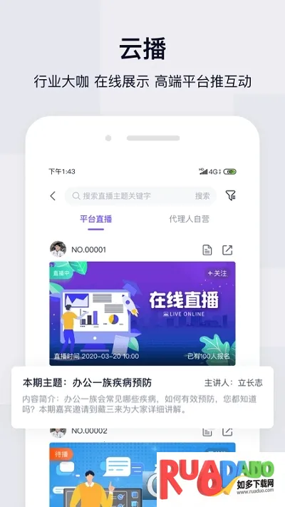 3. 能到云播中心观看直播,学习防疫等知识,平台的直播与待播连接在线展示,商城有丰富产品资源,还有可与客户互动的圈经营平台。